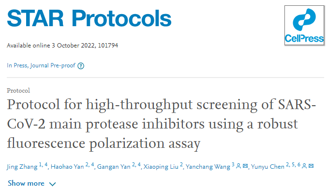 2022 年 10 月 3 日,皖南医学院陈云雨副教授与美国佛罗里达州立大学医学院王彦昶教授合作在 Cell Press 旗下杂志 STAR Protocols 发表了题为《Protocol for high-throughput screening of SARS-CoV-2 main protease inhibitors using a robust fluorescence polarization assay》的实验方案论文(Protocol)。该论文详细描述了一个经过优化和验证的基于荧光偏振技术原理的 Mpro 小分子抑制剂高通量筛选方法,因其具有操作简便,灵敏可靠,经济廉价等优点,非常适合大规模的高通量筛选实验。