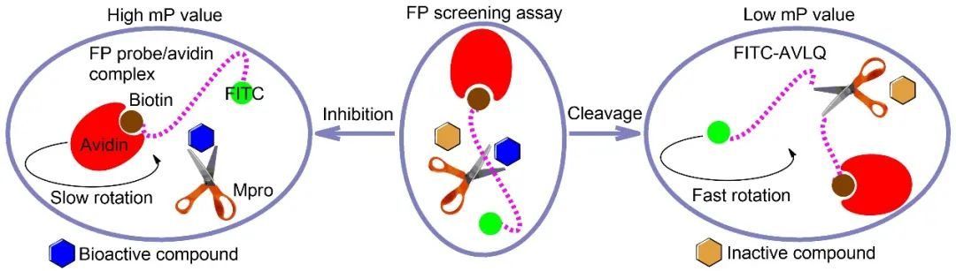 在本筛选模型的设计中,以荧光探针 FITC-AVLQSGFRKK-Biotin 作为 Mpro 水解底物,活性化合物由于抑制 Mpro 对荧光探针的水解作用,故此荧光探针可与亲和素结合,分子量增大,旋转速度变慢,表现较高的 mP 值;非活性化合物由于不能抑制 Mpro 对荧光探针的水解作用,将切割荧光探针产生分子量较小的 FITC-AVLQ 片段,旋转速度加快,表现较低的 mP 值。研究者通过判断实验体系中 mP 值的变化即可快速筛选到苗头化合物。