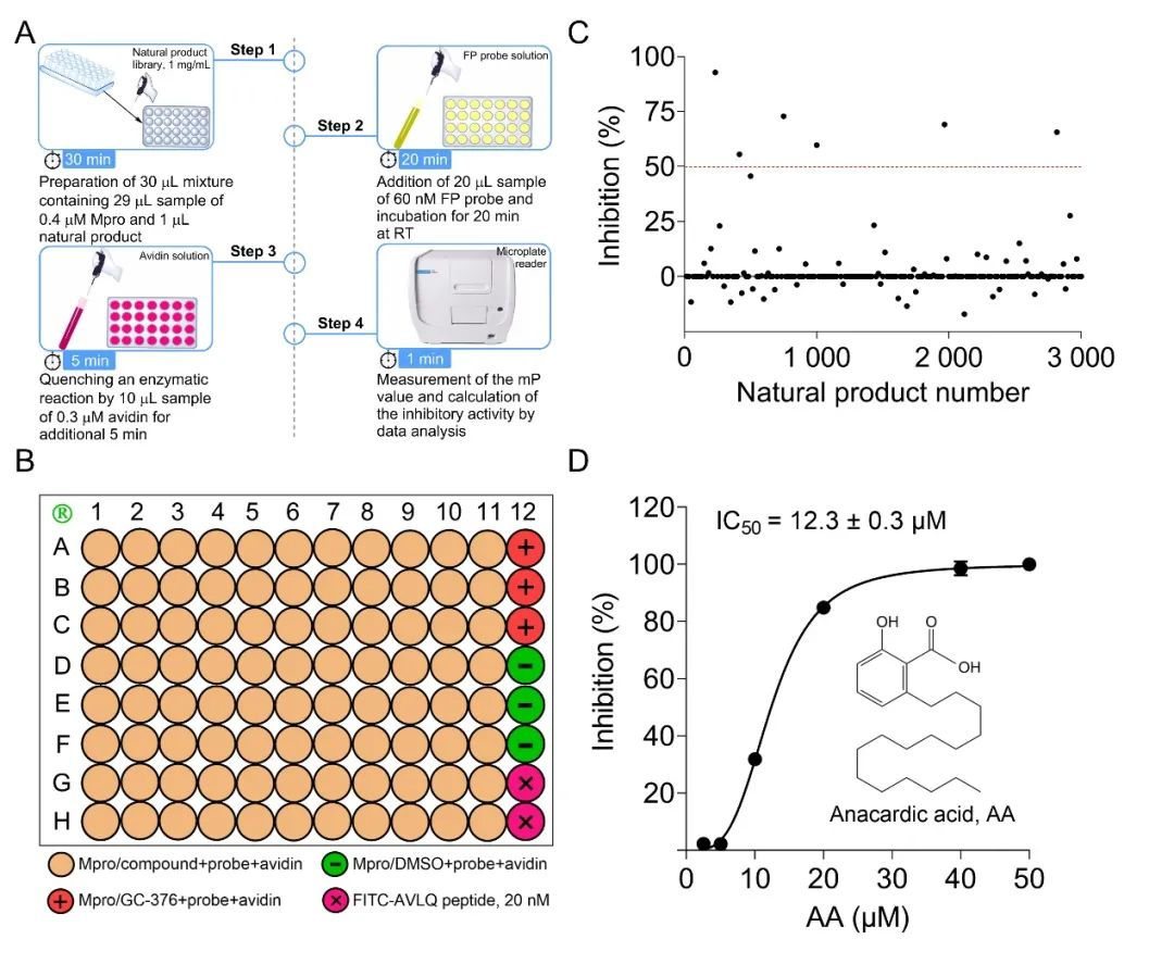 本筛选模型使用时主要包括 4 步操作,且每轮筛选时间约为 1 h。其主要操作方法如下:首先,将 0.4 μM Mpro(29 μL/孔)与天然产物(1 mg/mL, 1 μL/孔)室温孵育 30 min。再加入 60 nM 荧光探针(20 μL/孔)进行 20 min 水解反应后,继续加入 0.3 μM 亲和素(10 μL/孔)孵育 5 min,终止其水解反应,最后以多功能酶标仪(Agilent BioTek Cytation5)检测其 mP 值并进行数据分析。