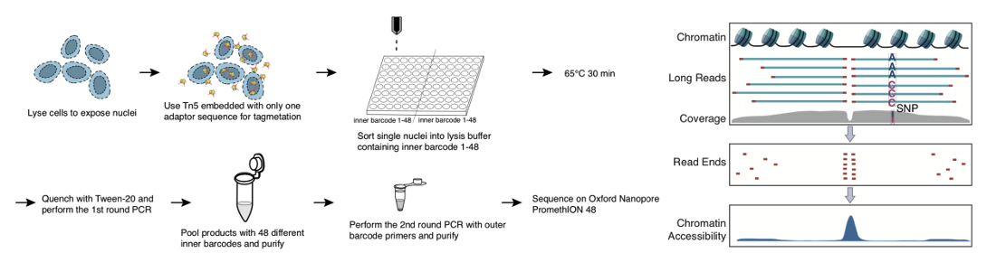 图1. scNanoATAC-seq实验流程图(左)和分析原理图(右)