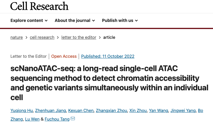 2022年10月11日,北京大学生物医学前沿创新中心(BIOPIC)汤富酬课题组在Cell Research发表了题为scNanoATAC-seq: a long-read single-cell ATAC sequencing method to detect chromatin accessibility and genetic variants simultaneously within an individual cell的论文,首次报道了名为scNanoATAC-seq的基于三代测序平台(单分子测序平台)的单细胞染色质可及性测序技术。该技术整合了长读段单分子测序平台和单细胞染色质可及性测序技术(scATAC-seq:Single cell Assay for Transposase Accessible Chromatin with high-throughput sequencing)的优势,实现了在一个单细胞中同时检测染色质开放状态以及基因组结构变异。