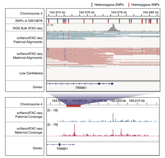 图4. 用scNanoATAC-seq技术鉴定出来的印记基因TRIM61的启动子差异甲基化区域的等位基因特异性的染色质开放区域