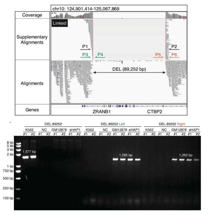 图5. 用scNanoATAC-seq技术鉴定出来的ZRANB1和CTBP2两个基因上的结构变异(大片段缺失)事件(上)以及PCR验证结果(下)