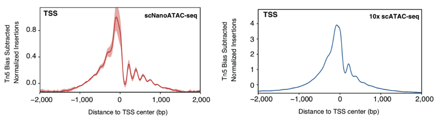 图8. scNanoATAC-seq和10x scATAC-seq测序片段在转录起始位点附近信号富集的情况