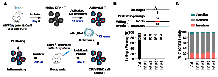作者利用了徐墨课题组之前建立的小鼠肠炎模型5来研究过继性T细胞中基因编辑导致的染色体结构变异在体内命运。在该体系中,仅表达特异识别Helicobacter hepaticus细菌抗原的TCR 的T细胞,首先在体外激活并被Cas9编辑。成功编辑的细胞将被输注至已经定植了Helicobacter hepaticus的免疫缺陷鼠中,进而诱发T细胞依赖的肠炎(图一),该炎性过程与TCR-T或CAR-T细胞介导的肿瘤免疫治疗高度类似。随后,作者利用胡家志课题组前期开发高灵敏测序方法PEM-seq1,6(Nucleic Acids Research | 胡家志课题组开发全面评估基因编辑产物新方法,详细方案已于2022年发表在STAR protocols7),详细追踪并定量分析了Cas9编辑后的T细胞中的染色体结构异常在输注前、输注3周和2个月后的比例及分布特点。