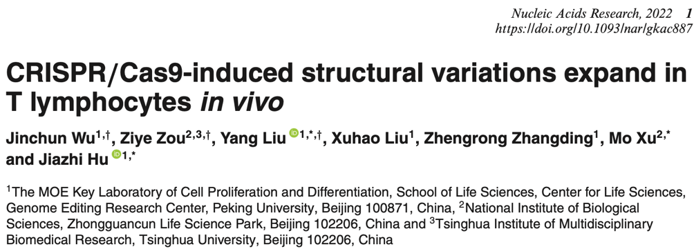 2022年10月16日,北京大学生命科学学院、生命科学联合中心胡家志研究员课题组及北京生命科学研究所/清华大学生物医学交叉研究院的徐墨课题组在Nucleic Acids Research上在线发表了题为“CRISPR/Cas9-induced structural variations expand in T lymphocytes in vivo”的研究论文,全面、定量、长时程地追踪分析了基因编辑导致的T细胞染色体结构异常在输注至小鼠体内后的动态变化。该研究发现基因编辑导致的染色体易位、染色体大片度丢失和病毒DNA插入在过继给小鼠2个月内,并不会随着时间的延长而消失,而是持续维持在较高水平并展现出明确的随机克隆扩增现象。尤其值得注意的是,部分结构变异甚至可在体内剧烈扩增至数万个拷贝,初现恶性扩增的苗头。