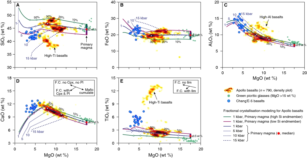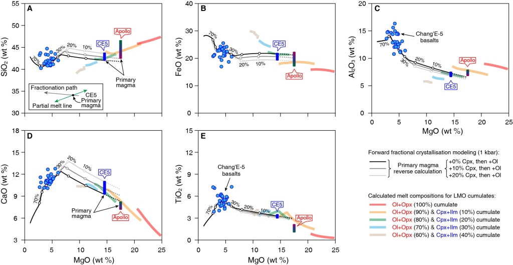 (1)与古老的阿波罗低钛玄武岩相比,年轻的嫦娥五号玄武岩的初始岩浆含有更高CaO和TiO2,以及更低MgO(图2);