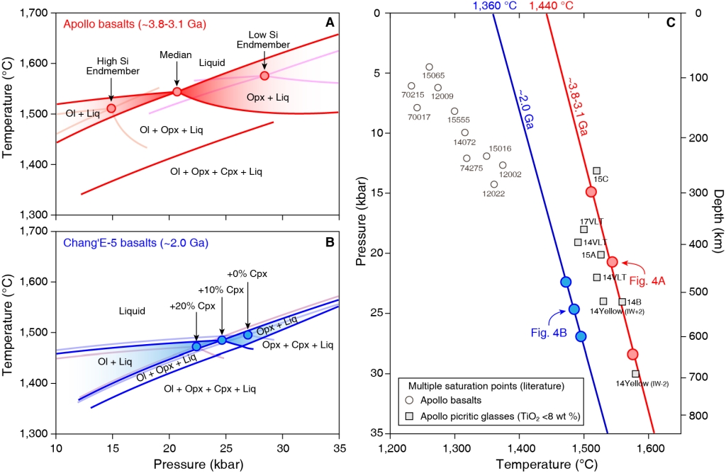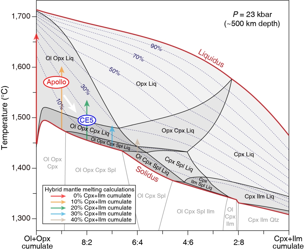 (2)与阿波罗低钛玄武岩相比,嫦娥五号玄武岩的源区含有更高的(~20%)岩浆洋晚期形成的单斜辉石-钛铁矿堆晶体,它们的加入会显著降低月幔的熔点,诱发年轻火山的形成(图3);