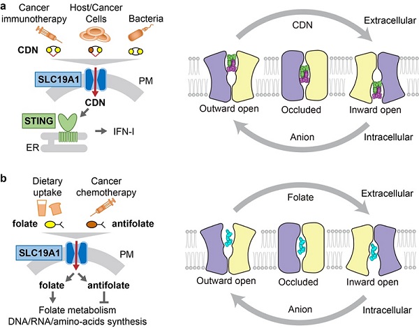 领域内一直关注的一个问题是极性的CDN分子如何跨膜进入细胞?有研究表明溶质载体家族蛋白SLC19A1是关键的CDN转运蛋白。除了CDN,SLC19A1还是主要的叶酸和抗叶酸转运蛋白。有趣的是,部分抗叶酸药物通过某种"神奇且未知的机制"被经常用于治疗一些自身免疫类疾病。SLC19A1由于能同时转运这两类底物,且对这两类底物的转运存在相互抑制,从而被推测可能在此过程中发挥作用。