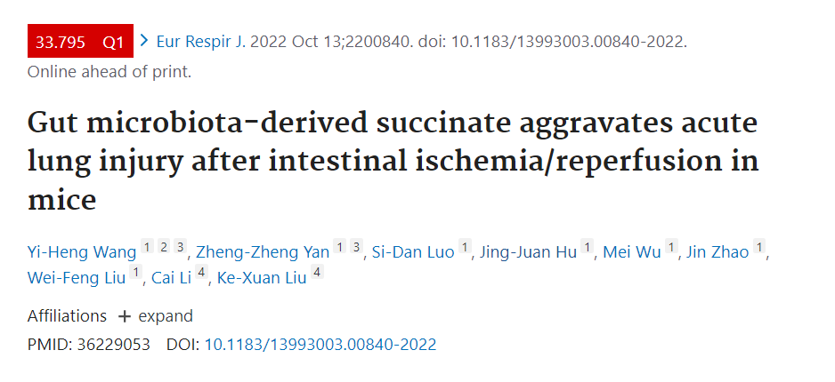 近日,南方医院麻醉科刘克玄教授团队在国际呼吸领域顶级期刊European Respiratory Journal(中科院小类呼吸病学一区,IF=33.795)上以论著形式在线发表了题为“Gut microbiota-derived succinate aggravates acute lung injury after intestinal ischemia/reperfusion in mice”的研究论文。麻醉科王宜衡博士和闫征征博士为论文共同第一作者,刘克玄教授和李偲教授为论文共同通讯作者,南方医科大学南方医院为论文第一署名单位。该论文是刘克玄教授团队继在Microbiome、Br J Anaesth、Gut Microbes等国际期刊发表肠道菌群相关的高影响力研究论文后的又一重要突破。