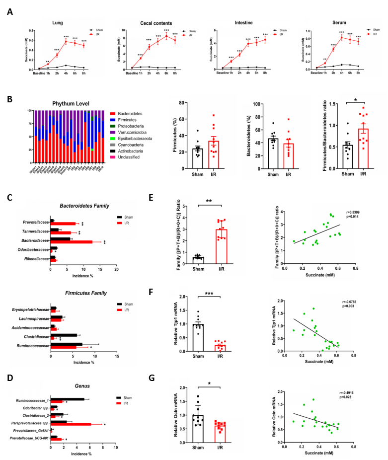 肠缺血再灌注(Ischemia/reperfusion, I/R)是临床常见的急危重症情况,常发生在创伤、感染、休克及肠梗阻、体外循环手术等临床现象中,不仅引起肠损伤,还因肠屏障破坏后菌群失调、内毒素移位,导致脓毒症及肠外多器官功能不全甚至衰竭。急性肺损伤(Acute lung injury,ALI)作为肠I/R最为常见的远隔脏器并发症,是该类患者死亡的主要原因。迄今为止,ALI的发病机制尚不明确且无有效的防治措施,是当前呼吸与危重病领域急需解决的科学问题之一。肠道菌群及其代谢产物可通过影响免疫系统功能参与许多肺部疾病的发生,然而在肠I/R所致ALI中的作用尚不清楚。为揭示上述问题,刘克玄教授团队复制了小鼠肠I/R诱导的ALI模型,同时通过16S rRNA菌群测序分析发现,肠 I/R引起肠道(而非肺部)产生琥珀酸的细菌丰度增加,而降解琥珀酸的细菌丰度减少。肠 I/R还可导致肺内琥珀酸的聚集;且肺内琥珀酸含量与肠道内产生琥珀酸细菌/降解琥珀酸细菌的比值[(P+T+B)/(R+O+C)]呈正相关。进一步,该团队通过抗生素清除实验、粪菌移植实验及体内荧光素标记实验等技术方法证实:①广谱抗生素清除肠道菌群的伪无菌小鼠与无菌(Germ-free, GF)小鼠在肠I/R后,其肺内积聚的琥珀酸含量显著下降,肺部炎症与肺损伤显著减轻;②GF小鼠在移植肠I/R小鼠的粪便后肺内琥珀酸积聚、肺部炎症与肺损伤的表型得以复现;③采用携带绿光标记的FAM-琥珀酸对小鼠进行灌胃处理,再复制肠I/R模型,发现肠道与肺部荧光信号增强,提示肠I/R期间琥珀酸从肠转移到肺。这些研究结果均表明,肠I/R期间肺内积聚的琥珀酸来源于肠道菌群,而肠道菌群代谢物琥珀酸则是导致肠I/R后ALI的重要媒介。
