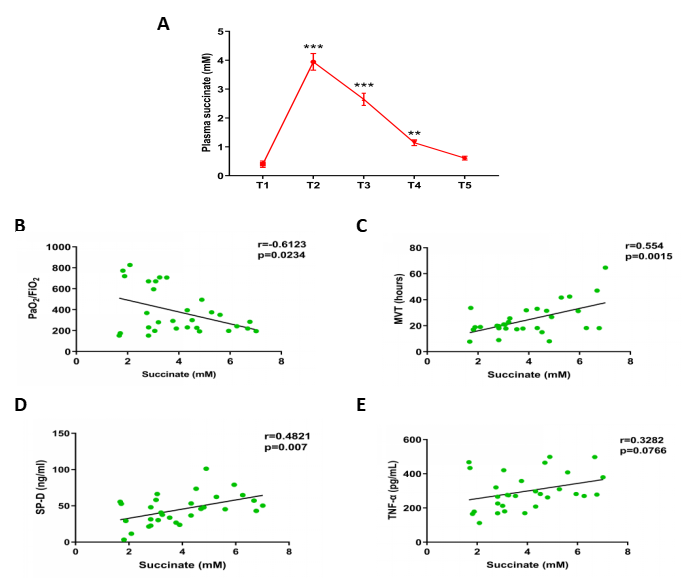通过临床验证发现,体外循环心脏手术患者术后早期血浆琥珀酸水平升高,且血浆琥珀酸含量与体外循环术后反映肺损伤的相关指标呈显著的正相关,进一步提示琥珀酸与肠I/R导致的ALI有关。