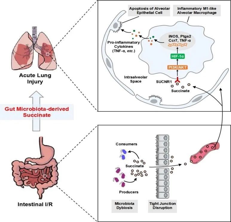 该研究首次揭示了肠道菌群代谢产物琥珀酸在肠 I/R 所致 ALI 过程中的关键性作用,琥珀酸作为肠道菌群的重要代谢产物,通过作用其受体 SUCNR1 促进肺泡巨噬细胞极化,进而导致肺损伤。该研究不仅从“肠道菌群-肠-肺轴”的全新角度揭示了肠源性 ALI 的发生机制,同时率先提出了琥珀酸是急危重患者肠源性 ALI 防治的新靶点,未来靶向调控琥珀酸代谢相关的肠道菌群或是防治肠源性肺损伤的有效手段。
