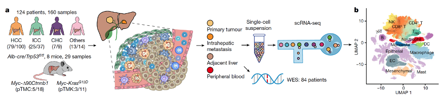 免疫微环境的异质性是肿瘤耐药、复发和预后差的重要原因之一。近年来,免疫治疗及相关联合治疗方案给晚期肿瘤患者带来希望,系统探究肿瘤免疫微环境的异质性对于治疗选择、疗效预测、方案优化及开发新的免疫治疗靶点等有重要指导作用。 然而,我们对肝癌免疫微环境的异质性仍缺乏系统深入的认知。以往研究主要基于病理分析或Bulk转录组测序,其结果无法准确解析其细胞组成且容易忽略含量较少的关键细胞亚群。单细胞测序技术的发展促进了肿瘤免疫领域的探索,目前多项研究已对肝癌进行了单细胞水平的探究。然而,这些研究大多关注特定类型细胞,其结果无法反映免疫微环境的全部特征。因此,亟需无偏差的、包含所有细胞亚型的研究策略以系统揭示肝癌免疫微环境的异质性。
