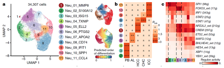 图3 中性粒细胞亚群的组织分布、发育轨迹、癌种富集和关键转录因子