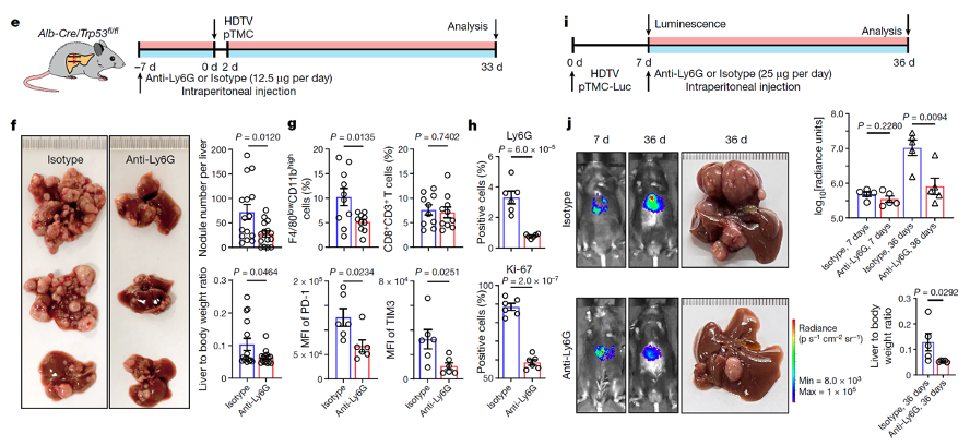 图4 Anti-Ly6G抗体去除中性粒细胞可以有效缓解小鼠肝癌生长