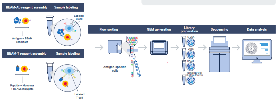 将感兴趣的抗原与特定的B细胞或T细胞受体相匹配,这项工作仍然很困难且成本高昂。传统的方法时间长、效率低,且缺乏全长配对V(D)J受体序列。BEAM通过提供即用型试剂盒来解决这些挑战,它能够对感兴趣的抗原进行独特标记和多重分析。