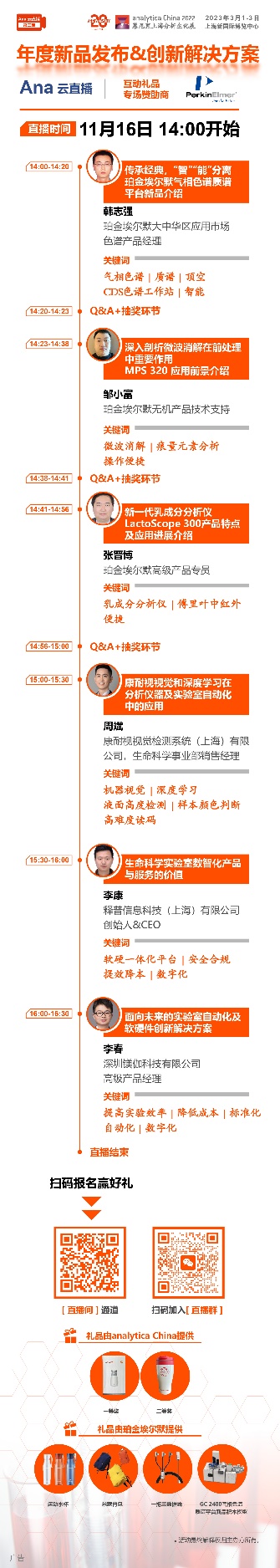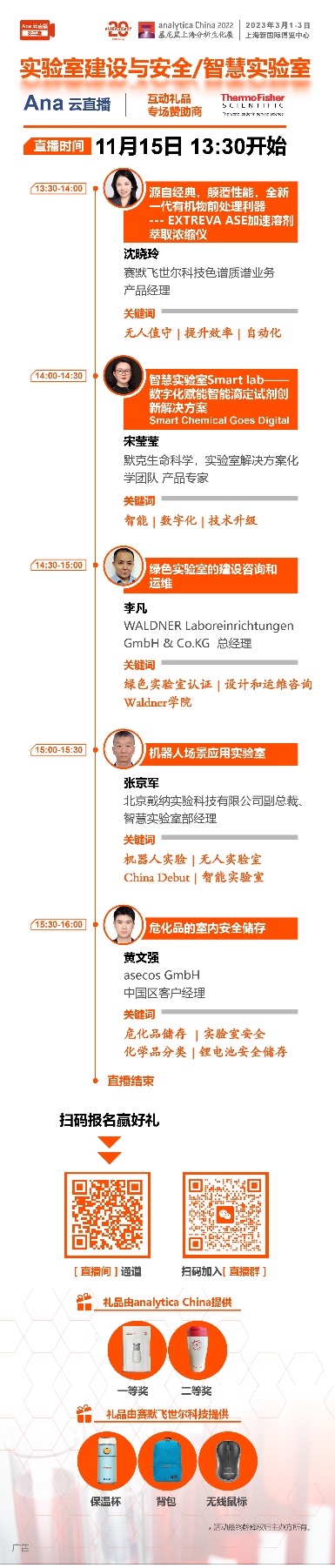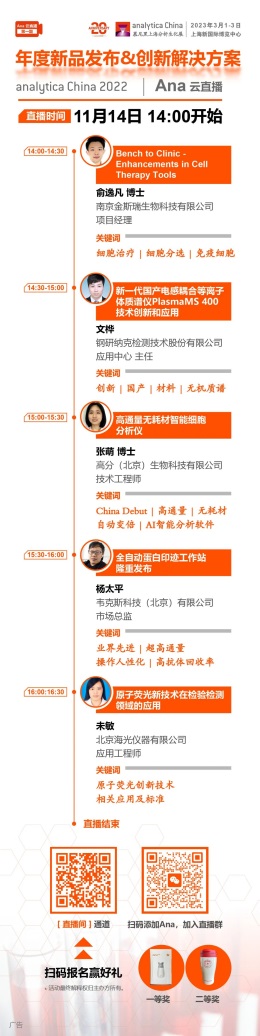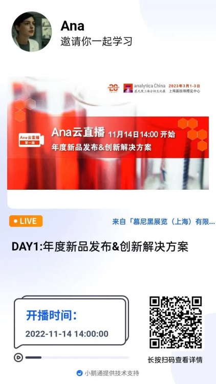 作为世界分析、实验室技术、诊断和生化技术风向标盛会, 2022慕尼黑上海分析生化展( analytica China 2022)将延续在线直播服务——《Ana云直播》,于11月14日14:00开播!面向20万+政府、科研、临床、企业实验室负责人、研发、质量控制人员、实验室仪器与设备厂家及实验室设计与规划单位;邀请行业大咖及企业专家等重量级嘉宾亲临直播间,带来科学技术和行业技术的分享与交流。