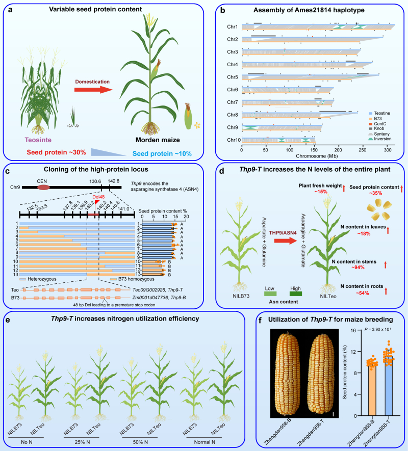 本项研究从野生玉米中发现一个控制高蛋白玉米形成的关键优异变异基因Thp9-T,它可以提高玉米中氮的同化效率从而有利于产生更多的蛋白质。将Thp9-T导入现代玉米品种,大大提高了氨基酸水平,尤其是天冬酰胺,并且在不影响粒重的情况下增加了种子蛋白质含量。同时,在大田试验中,本项研究也验证了Thp9-T在高蛋白育种改良过程中起着重大作用,不仅显著提高玉米栽培品种郑单958的籽粒蛋白含量,而且在在低氮条件下能有效保持玉米的生物量以及植株和籽粒氮含量水平,对今后该基因的进一步推广应用奠定了坚实基础。