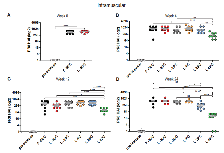 如上图所示,冻干疫苗在不同温度下储存不同时间后,通过肌肉注射到小鼠体内,在4周后通过测定小鼠体内的HA效价来评估疫苗的有效性。结果显示:冻干PR8 mRNA-LNP疫苗在室温下储存12周后没有失去活力 ,在24周时失去了一部分活力。而冻干疫苗储存在4℃储存至少24周没有导致免疫原性的任何损失。