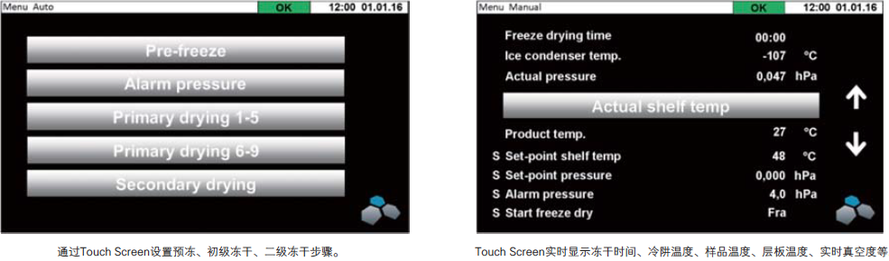 • Touch版本的控制系统,可以进行一系列的预冻、初级冻干步骤、次级冻干步骤的工艺优化
