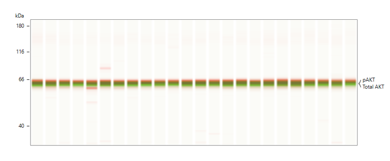 来自 Jurkat 细胞(用 calyculin A 处理)的裂解物 (0.2 mg/mL),并使用小鼠抗总 AKT 和兔抗磷酸 AKT 一抗以及 Stellar Mouse IR(绿色条带)和 Stellar Rabbit NIR(红色条带)检测模块进行探测。Stellar NIR / IR 通道能够在同一泳道中多重检测总 AKT 和磷酸化 AKT,并具有出色的重现性( 24 个泳道: pAKT <10% CVs 和 Total AKT <5% CVs)。