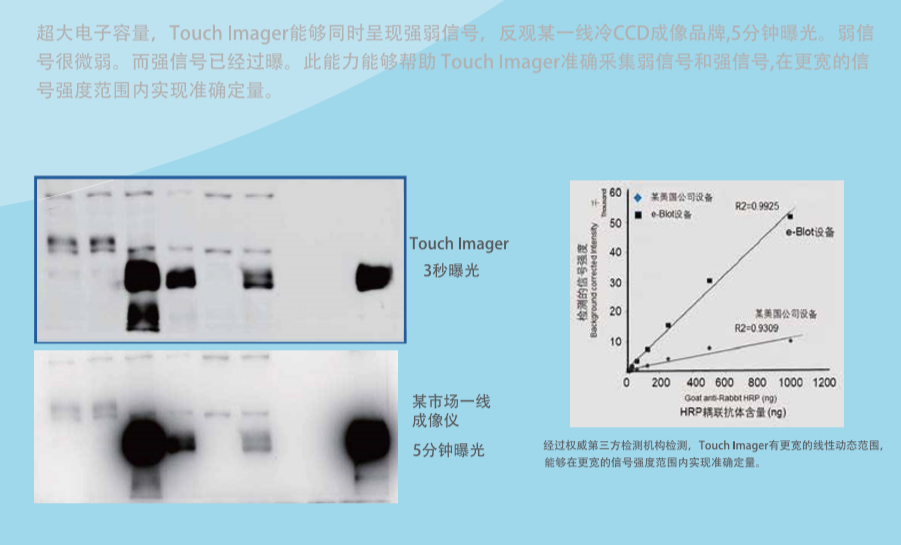 e-BLOT接触式化学发光成像技术克服了现有冷CCD成像技术在成像灵敏度、定量范围、成像速度和仪器体积大等诸多瓶颈,将成像灵敏度提升了2个数量级,定量范围提升2个数量级,>90%的样品1秒内完成成像,且仪器的体积不到传统仪器的1/10。