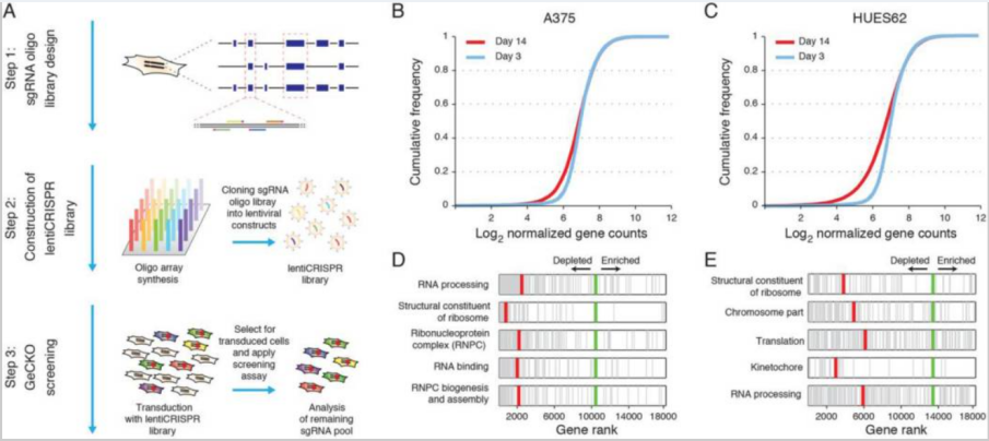 图1. 利用CRISPR文库筛选A375与HUES62存活必需基因