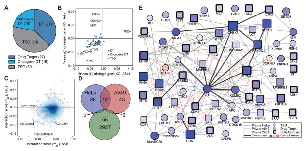 合成致死最典型的应用就是PARP抑制剂治疗BRCA1/2突变的肿瘤,截止2020年,PARP抑制剂全球销售额已经超过20亿美元!那么如何寻找更多具有合成致死作用的基因对呢?CRISPR文库高通量筛选起了大作用!CRISPR文库筛选合成致死作用一般有两种逻辑,一种是直接设计双重打靶的gRNA载体,即在一个细胞内同时靶向两个基因,筛选具有合成致死作用的基因对, Shen等[5]采用这种方法对3种实验癌细胞系(Hela、A549和293T)中的73个基因进行了150000个组合的筛选,找出120种有合成致死作用的基因对(如图3)。另外一种逻辑就是在单个抑癌基因敲除的细胞系上进行文库筛选,筛出与敲除的抑癌基因具有合成致死作用的靶点,Feng等[6]就是采用这种方法先在293A细胞上构建了12个已知抑癌基因敲除细胞系,再用全基因组敲除文库对野生型和敲除细胞系进行CRISPR筛选,分析同一细胞筛选前后gRNA的丰度变化,通过对比野生型和抑癌基因敲除细胞系在CRISPR筛选后gRNA的丰度差异确定潜在的合成致死基因。