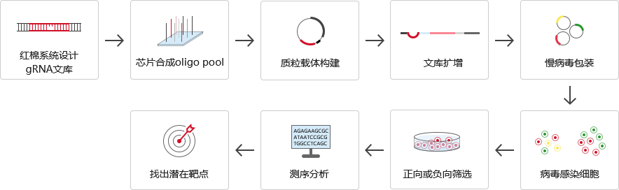 CRISPR文库是基于CRISPR/Cas9技术建立的高通量基因筛选方案。通过高通量合成sgRNA构建质粒文库,包装为慢病毒后以低MOI(通常<0.3)感染待筛选细胞,确保一个细胞只进入一种sgRNA,再给细胞加以筛选因素(如药物处理、低氧处理、病毒感染或细胞本身的生存能力等),收集筛选后的细胞进行NGS测序,分析实验组与对照组之间sgRNA的富集或耗竭情况,获得与筛选因素相关的宿主因子。