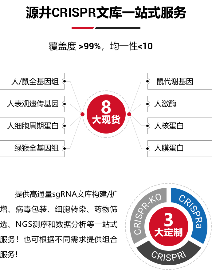 源井可提供人/小鼠全基因组文库,激酶、核蛋白、细胞周期蛋白、代谢相关蛋白和表观遗传相关蛋白亚文库等CRISPR现货文库,覆盖度>99%,均一性<10,点击了解产品详情>>