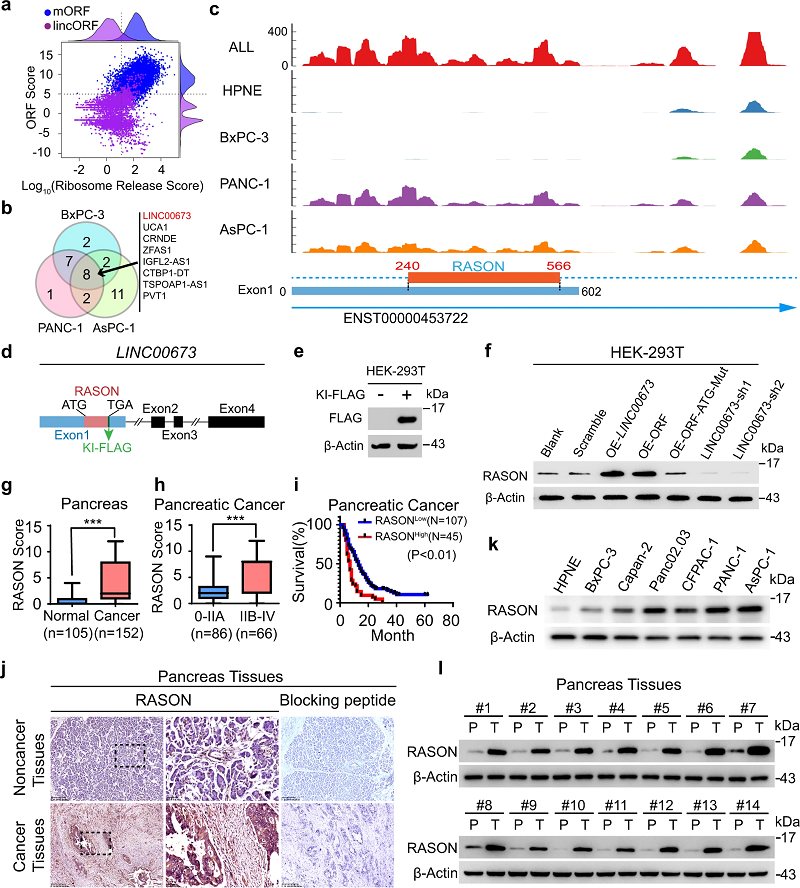 在比较三种PDAC细胞系与正常胰腺导管细胞系后,他们发现8个基因间长链非编码RNA(lincRNA)存在差异翻译,其中LINC00673位列第一。PDAC患者的肿瘤样本与癌旁正常组织的比较也表明,LINC00673存在差异表达。他们通过免疫印迹分析证实LINC00673编码了一种108个氨基酸的蛋白质,并命名为RASON。