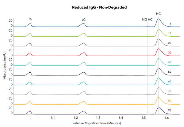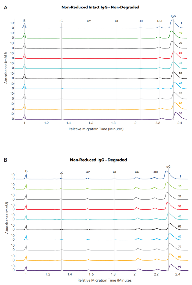 ⬆ 96个非还原型和还原型USP IgG样品重复性极佳;百分比峰面积CV值为≤0.4%和 ≤0.8%;