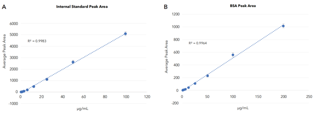 ⬆ 内标检测动态范围为100-0.4 μg/mL;BSA检测动态范围为200-0.8μg/mL,至少2 logs;