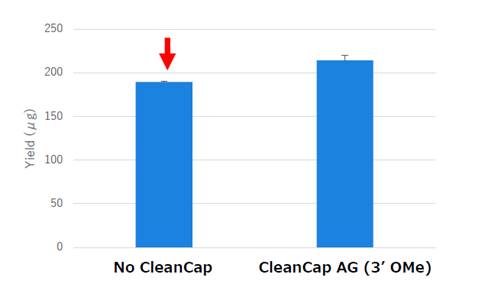此图分别为加入和不加入CleanCap Reagent AG (3'OMe)的情况下,IVT反应溶液中合成Firefly luciferase (萤火虫荧光素酶 ,FLuc) mRNA的产量。由此可见由此可见,Takara IVTpro™ mRNA合成系统兼容CleanCap试剂,使用CleanCap不影响mRNA产量。