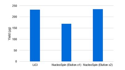 在含有CleanCap Reagent AG(3'OMe)和N1-甲基假尿苷的IVT反应溶液中合成FLuc mRNA,并分别通过LiCl沉淀法和离心柱法进行纯化(NucleoSpin RNA Clean-up)。 结果显示,用离心柱法仅一次洗脱(Elution x1)得到的RNA要比LiCl沉淀法要少,但两次洗脱(Elution x2)的RNA量与LiCl沉淀法大致相同。所以使用离心柱法时我们建议进行两次洗脱,而氯化锂沉淀法仅需一次即可。