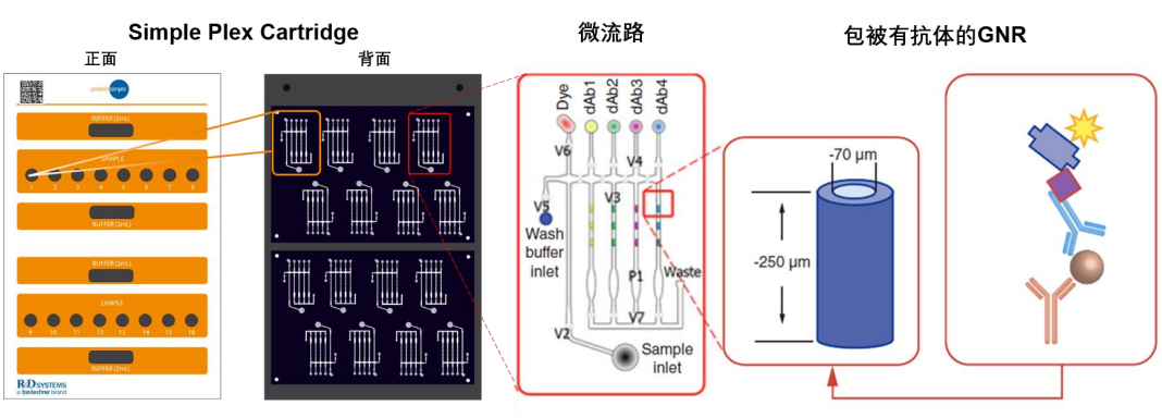 Ella检测原理如下图所示,全自动微流控多因子ELISA技术彻底颠覆了传统,创新性将特异性捕获抗体包被在微流体玻璃反应管(Glass Nano Reactor,GNR)中,再将GNR嵌入全自动微流体免疫检测管。Ella可自动取样本和检测,最后自动输出3个平行GNR的数据及均值。