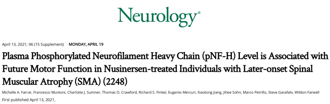 参考文献:Michelle A. Farrar et al. “Plasma Phosphorylated Neurofilament Heavy Chain (pNF-H) Level is Associated with Future Motor Function in Nusinersen-treated Individuals with Later-onset Spinal Muscular Atrophy (SMA) (2248).” Neurology (2021).