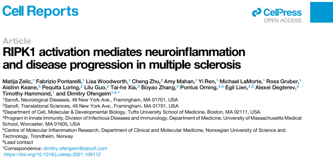参考文献:Zelic, Matija et al. “RIPK1 activation mediates neuroinflammation and disease progression in multiple sclerosis.” Cell reports (2021).
