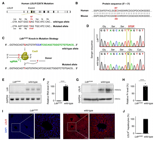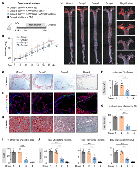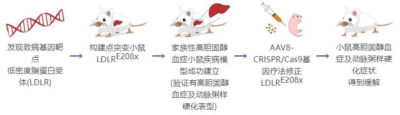 家族性高胆固醇血症(FH)是一种常见的遗传性高脂血症,通常由低密度脂蛋白受体(LDLR)基因突变所致。研究人员通过CRISPR/Cas9构建了点突变小鼠模型,并采用AAV-CRISPR/Cas9基因治疗技术,结果证实AAV-CRISPR/Cas9系统对携带Ldlr突变的小鼠进行的LDLR基因校正能够部分地修复LDLR表达,并有效改善LDLR突变体中的动脉粥样硬化,为FH患者的治疗提供潜在的治疗方法。