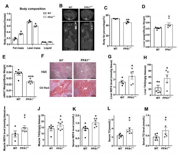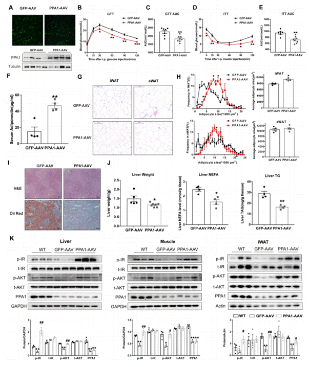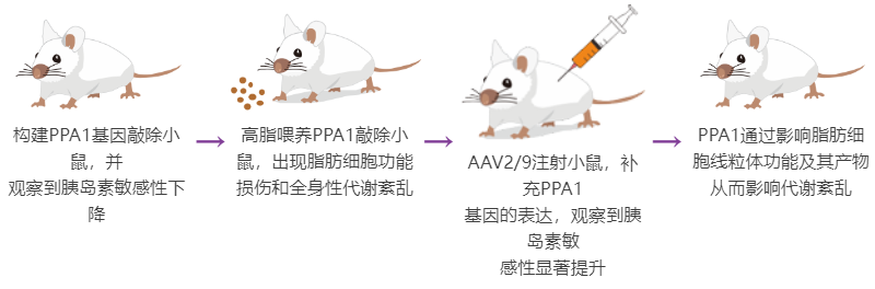 近年来研究表明胰岛素抵抗与代谢紊乱相关,为探讨PPA1对全身性胰岛素敏感性的影响,研究人员首先构建了PPA1基因敲除小鼠,通过高脂喂养后出现脂肪细胞功能损伤和全身代谢紊乱,并表现出多组织的胰岛素抵抗。进而通过AAV递送系统使PPA1基因敲除小鼠体内过表达PPA1,发现全身性代谢紊乱和胰岛素抵抗得到了显著改善,进一步证实PPA1可作为PPARγ靶基因,起到维持脂肪细胞线粒体功能并达到调节全身胰岛素敏感性的作用。