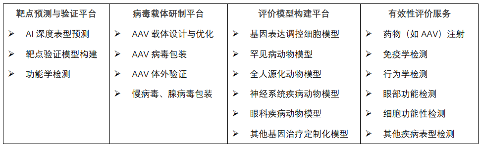 赛业生物作为一家综合解决方案提供商,建立了多位一体的创新性CRO平台服务网络。在过去十余年,赛业生物积累了大量的生物信息及基因编辑方面的数据,病毒包装、细胞稳转株与基因编辑模式动物方面项目经验,可为从事基因治疗的研究者提供更高效的基因功能解析与基因治疗整体解决方案,包括靶点预测与验证研究,动物模型构建和病毒载体如AAV、LV、ADV等设计与包装,以及有效性评价等全流程服务。