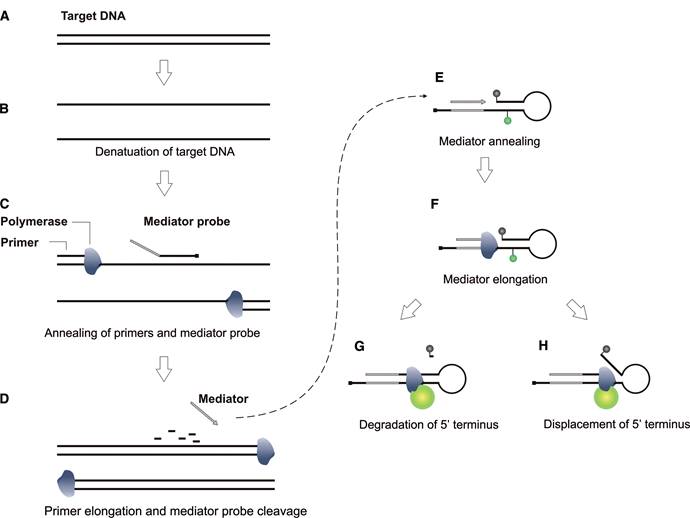 在 PCR 进程中,DNA 变性形成单链后,媒介探针 MP 随即和 DNA 特异性序列结合(图 2C)并在聚合酶和引物的作用下进行延长;当聚合酶跨过 MP 的位置时,其具有的核酸外切酶活性将 MP 的 5’ 端 Mediator 切掉并释放到溶液中(图 2D),随着 DNA 的复制,Mediator 逐渐积累;Mediator 在溶液中扩散并被通用探针 UR 的杂交位点捕获结合(图 2E),并在聚合酶的作用下将 Mediator 的 3’ 端延长,当到达发卡结构位置时(图 2F),通过可能的两种方式将淬灭基团和荧光基团进行分离,一种是将淬灭基团直接切割(图 2G),另一种是使发卡结构松动并打开(图 2H),两种方式最终使荧光基团淬灭的 FRET 解除,即可在相应检测仪器中检测到荧光,从而通过荧光间接定量核酸浓度。