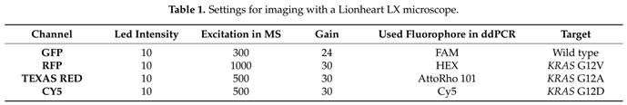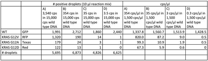 实验中,将 mutant DNA 稀释为 4 个浓度:3540 、354 、35 和 3.5 个 copies(cps)每个反应,用于每个 mutant 靶点,而 wild type DNA 浓度被固定在大约 15000 cps /反应。PCR 反应接受后,将 12 个 ddPCR 单元进行裁剪并粘贴在玻片上,使用 2.5x 物镜进行 56 个视野 Montage 扫描,Gen5 软件进行拼接,具体扫描参数如下:GFP 、RFP 、Texas Red 和 CY5 通道分别用于拍摄 FAM 标记的 WT 靶点、HEX 标记的 KRAS G12V 点突变、AttoRho 101 标记的 KRAS G12A 点突变和 Cy5 荧光基团标记的 KRAS G12D 序列。