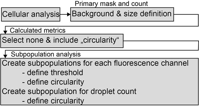 Gen5 软件通常可以用于细胞和细胞器计数分析,在这里,经过略微的调整,用于微滴计数并进行阳性和阴性微滴辨别。具体参数有背景荧光测定、微滴直径范围(45um ~ 90um)、微滴形状(圆度 >0.6)和荧光强度阈值。在进行亚群分析区分阳性和阴性微滴时,圆度和平均荧光强度这 2 个参数必不可少,非常重要的一点是,圆度作为分析参数,可有效排除灰尘颗粒或其他杂质。由于 GFP 通道具有最高的微滴背景信号,因此可用于检测计算微滴总数量,其余每个通道都作为一个亚群分析不同的突变位点。