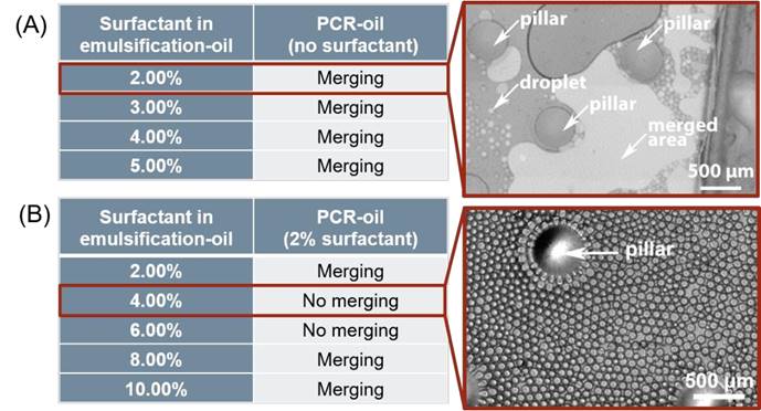 由于 oil 的蒸发也依赖于 PCR 循环的参数,包括温度和循环次数,因此不同的实验条件,表活剂的浓度可以进行优化调整,本实验中,4% 和 6%的表面活性剂浓度能够很好地保证微滴产生和 PCR 过程中的稳定性,而较低 2% 或过高则都会产生微滴融合。