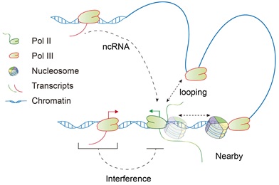 图2. Pol III 与Pol II 交叉调控的转录干扰(Interference), 成环(Looping)和非编码RNA (noncoding RNA)模型。