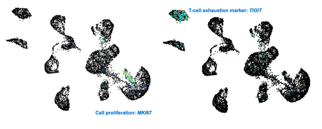 通过标志基因的表达情况,还能够看到细胞增殖以及耗竭性T细胞