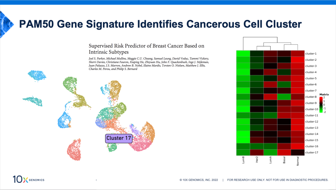 浸润性导管癌是乳腺癌最常见的病理类型。乳腺癌是由多种异型性病变组成的一大类疾病的集合体,虽然都命名为乳腺癌,但这些病变的异常分子、癌细胞构成以及临床转归都各不相同,因此使乳腺癌的肿瘤分类更显特别。经过不断的改进及演变,目前多基因预测成为了乳腺癌分型的一个新途径,但传统方法通常是基于bulk水平根据基因特征(gene signature)对癌症进行分类。现在有了单细胞FFPE解决方案,我们可以将基因特征应用于该数据集中的每种细胞簇,下图展示了将每个细胞簇与PAM50基因特征相关联。