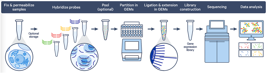 单细胞基因表达Flex方案让您能够使用固定剂在采集点“锁定”样本的生物学状态,然后使用带条形码的探针模板捕获片段化的RNA(还可选择细胞表面蛋白分析来实现多组学分析)(图1)。这将帮助您在更短的时间内捕获快速而微小的变化,保留在存储和解离条件下无法存活的稀有细胞和/或敏感细胞类型,灭活富含RNase的组织中的RNase,并确保整体的样本质量是稳定的。